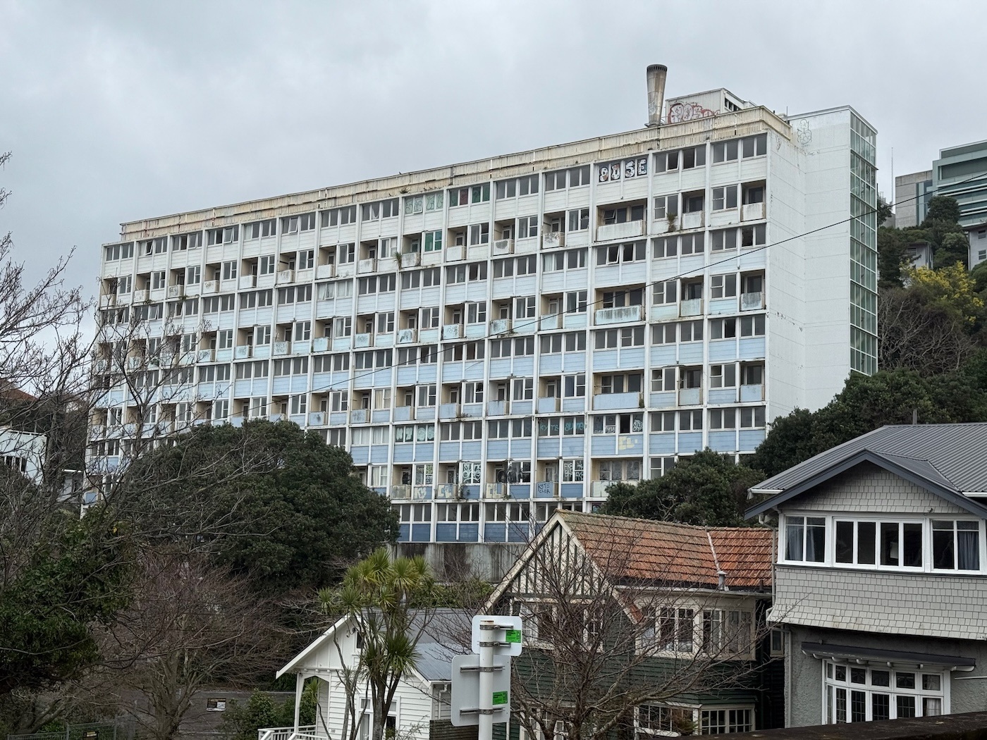 The abandoned Gordon Wilson Flats remain standing on The Terrace, despite Victoria University announcing in December last year that demolition would start that month.