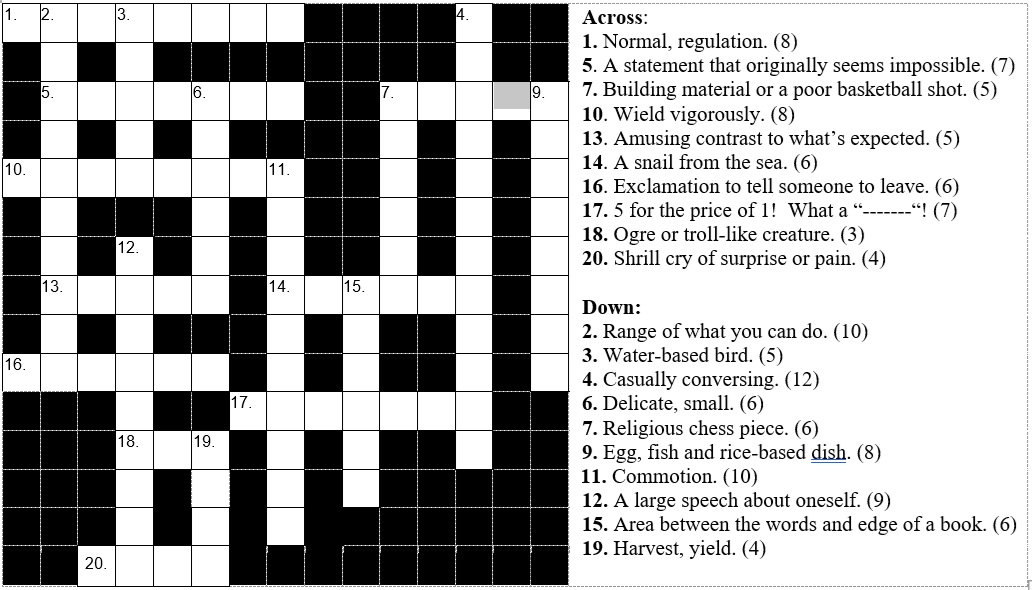 2. Repertoire, 3. Heron, 4. Chitchatting, 6. Dainty, 7. Bishop, 9. Kedgeree, 11. Hullabaloo, 12. Monologue, 15. Margin, 19. Crop.